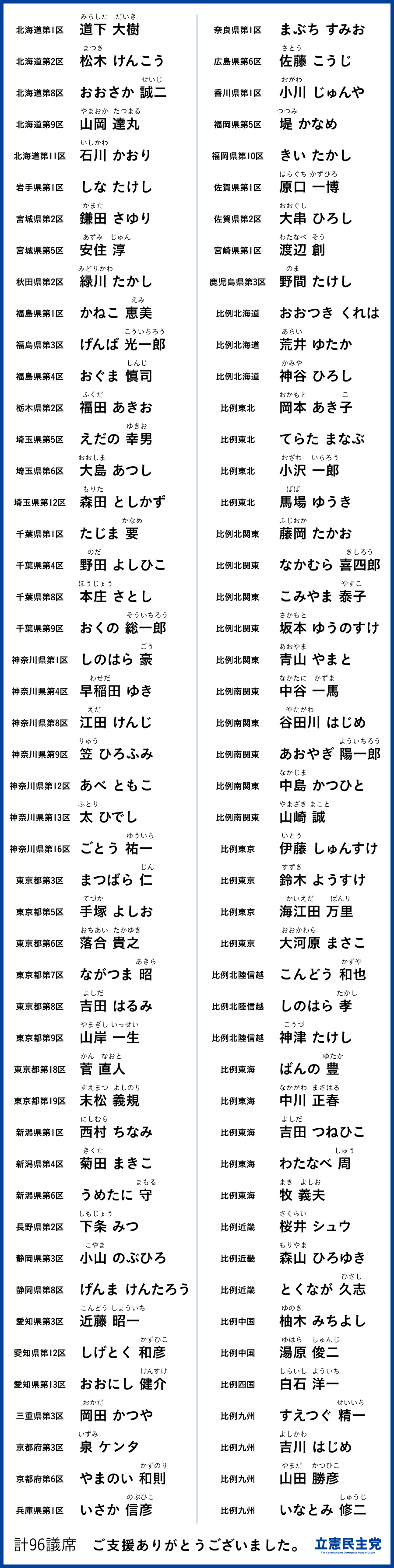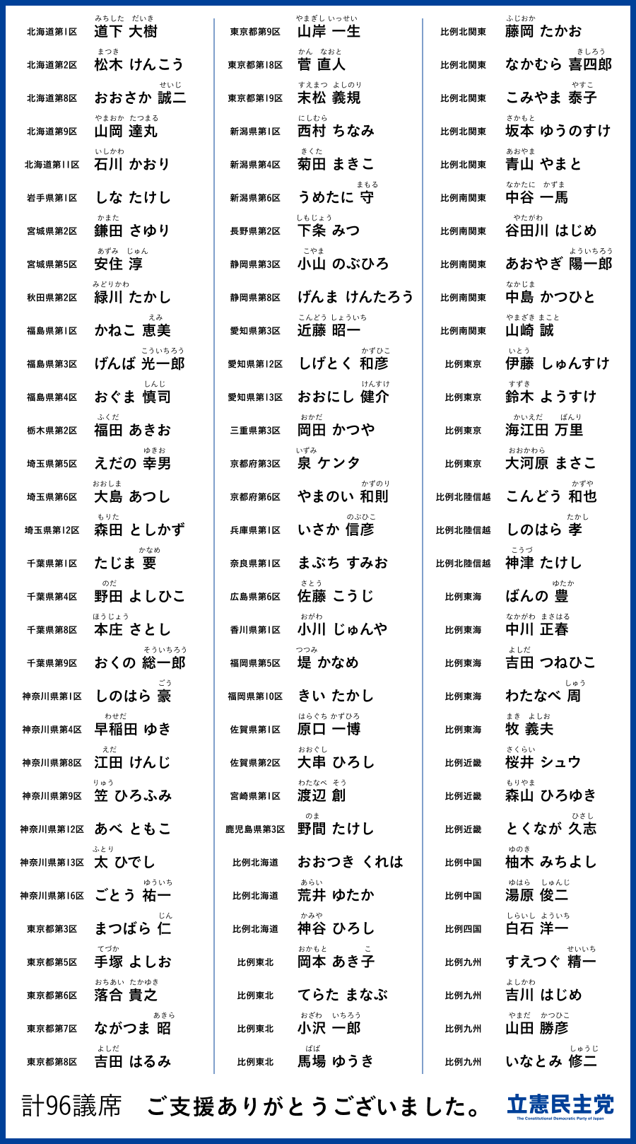 この度立憲民主党は、みなさまの多大なご支持をいただき、96議席を獲得いたしました。